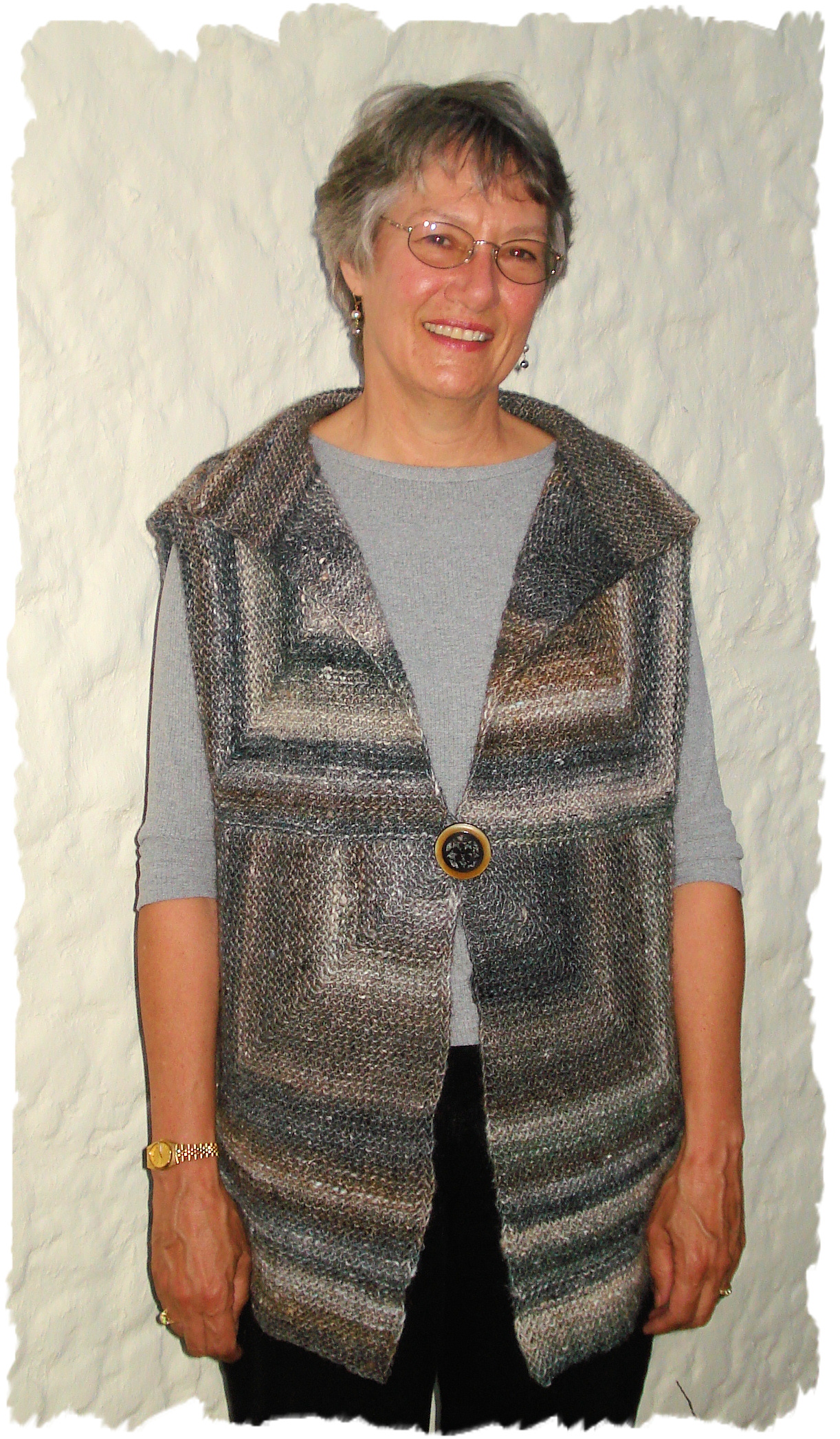 Debbie’s presentation was followed by Margaret’s latest works. She has been inspired by the book One Stitch Below by Elise Duvekot – knitting lap blankets. s She then showed us her Modular Garter-Stitch Vest which she knit in Noro’s Kureyon. The pattern came from Top-Down Sweaters by Doreen L. Marquart. As always, Margaret did a wonderful job and it’s a stunning modular work of art.