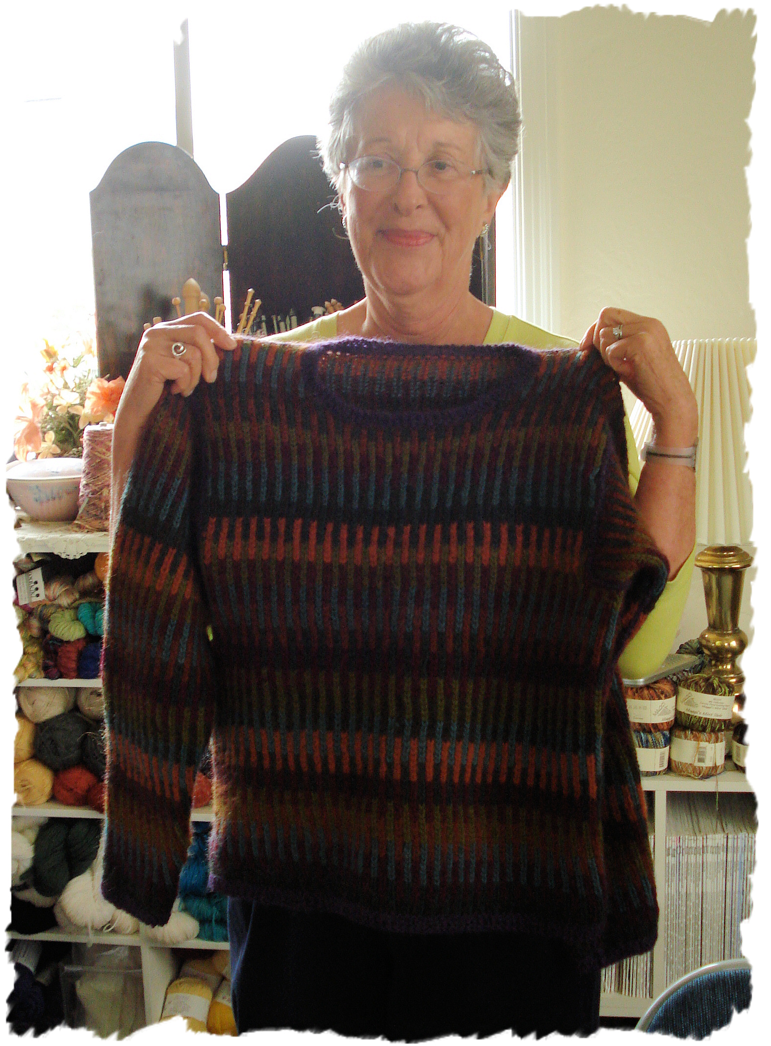 This will be a quick post to say that once again Jean has produced not just one but two wonderful garments from Knit One Below by Elise Duvekot. (This is the same book that I mentioned in the post about Margaret.) I am eager to recognize this work….knowing full well that I will be updating the photos….as the detail of the work does not show in these photos. The scarf is the Tattersall Scarf on page 118 and the sweater is the Non-Repeating Sweater on page 50. Over the years we have all seen Jean not only knit beautiful designs…but she wears them too! Her choices are perfect for her and for her giftees. Yeah Jean……a great knitter and friend. I believe she knits every day….and certainly most Fridays along with lots of laughter and story telling.