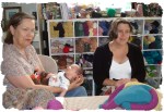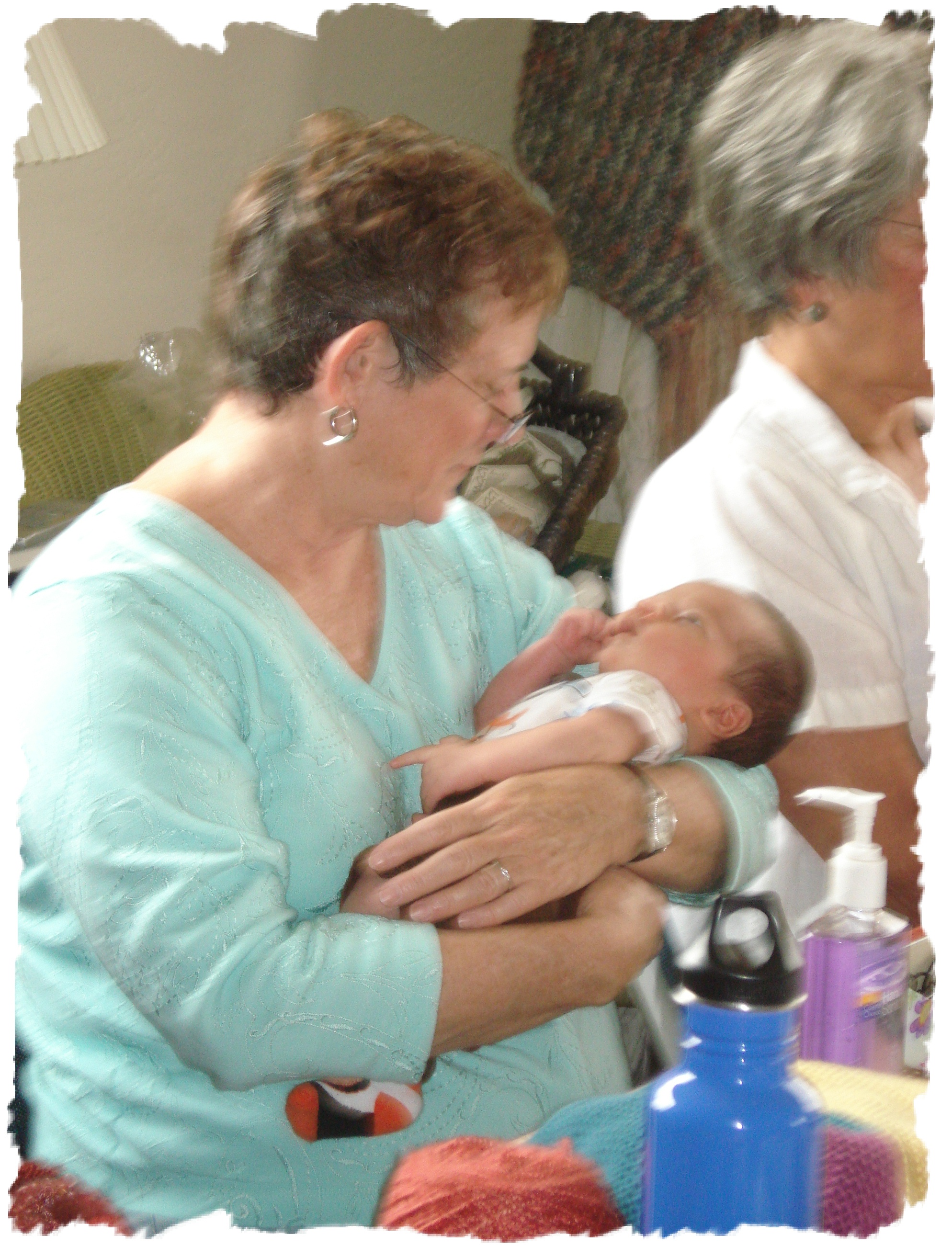 What an excitement loaded morning….designs, sharing, laughter and baby Elliot came with his mother Natasha. Once again….you’d think we’d never seen a baby….so many oohs and aahs! And he really is a lovely baby and so glad that Natasha can be with us. Some of the other highlights: Eleanor shared her Sock Summit experience (you might also want to check the Yarn Harlot’s blog), Terry shared another one of her creations, Cathy – a truly left-handed continental knitter – shared her latest translation of cable instructions as well as a baby sweater for her grandchild, Rebecca just completed a hat, Maurie is working on her adult surprise sweater, Susanne is finishing a cape stole, Diane has finished her Moderne Baby Blanket and is now working on the completion of her top-down sweater, Marsha is working on an adult Moderne Blanket, and yes…Natasha can still knit – she is working on an Feather Ripple Afghan using deep rich red and rust colors, Katie is knitting away with her gift scarves, Nina is on her rendition of MaggiKnits La Alhambra design, and Margo is making progress on her blue sweater…a lace design.
