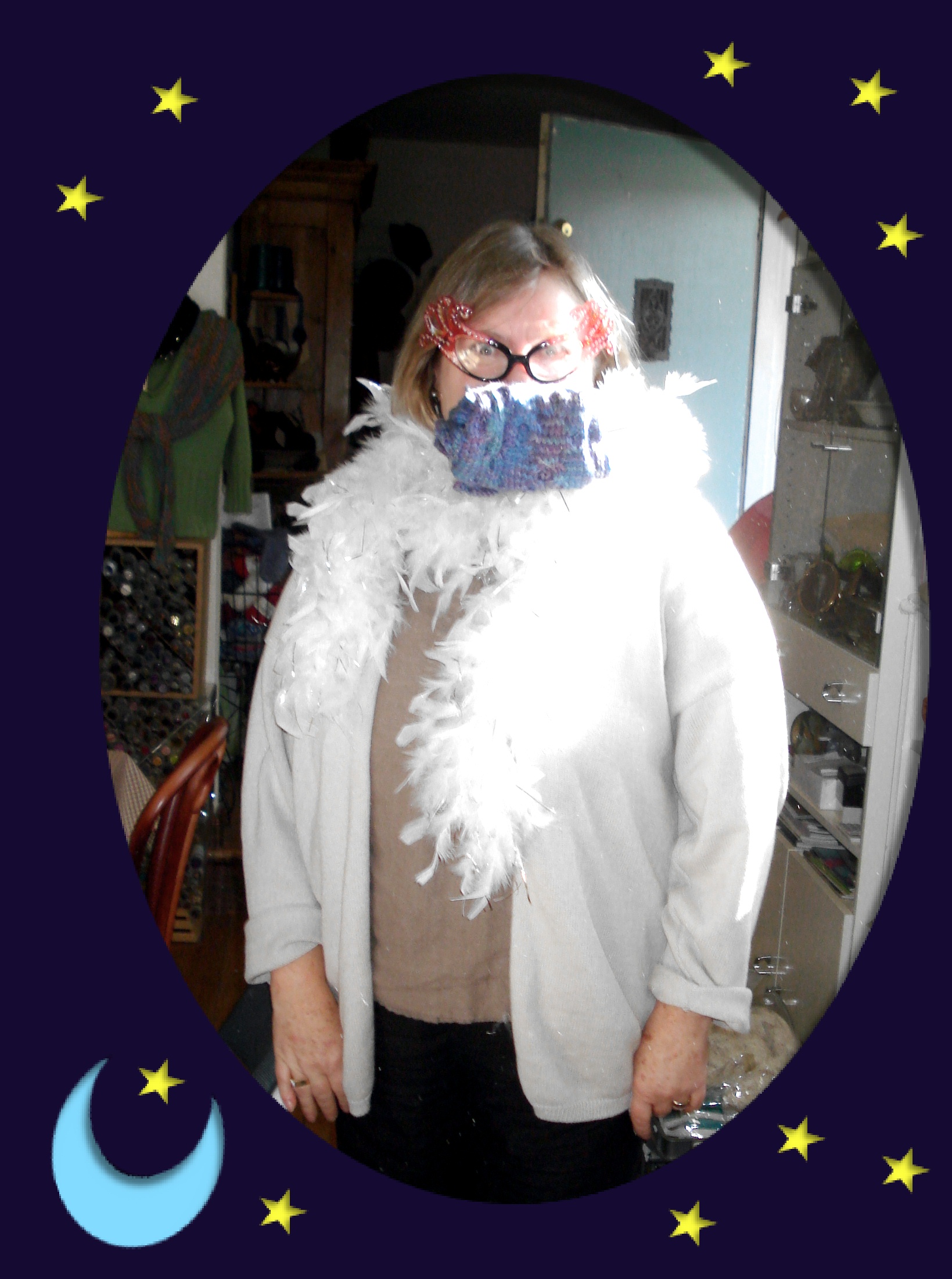 First Barbara arrives donned in jester hat and mask….then I remember it’s Halloween! Barbara is followed by Jan who arrives with a boa and her cat glasses…..she brought the boa for the Purl girl Kimberly.
