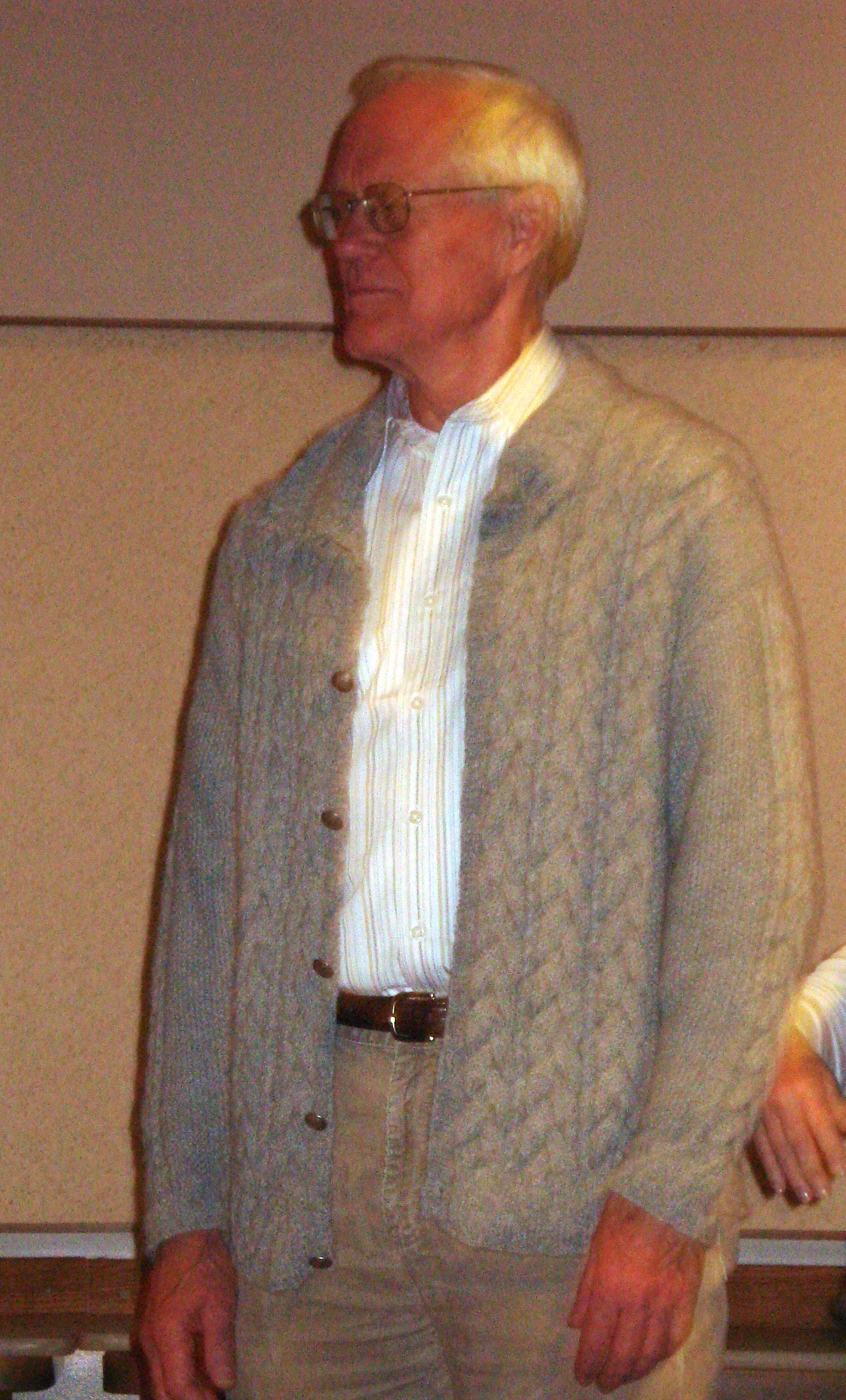- Nick modeling a design knit by his wife Eleanor
