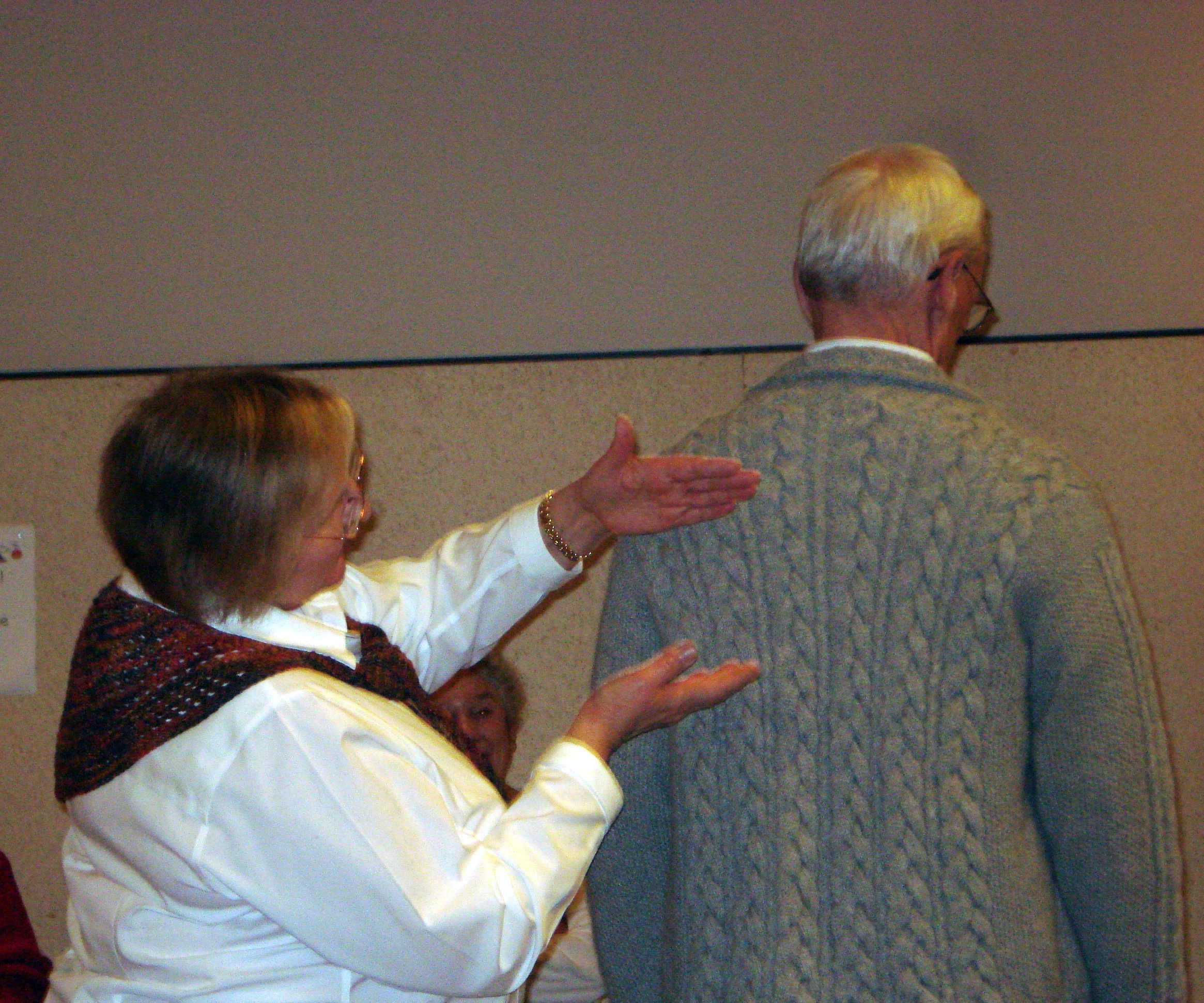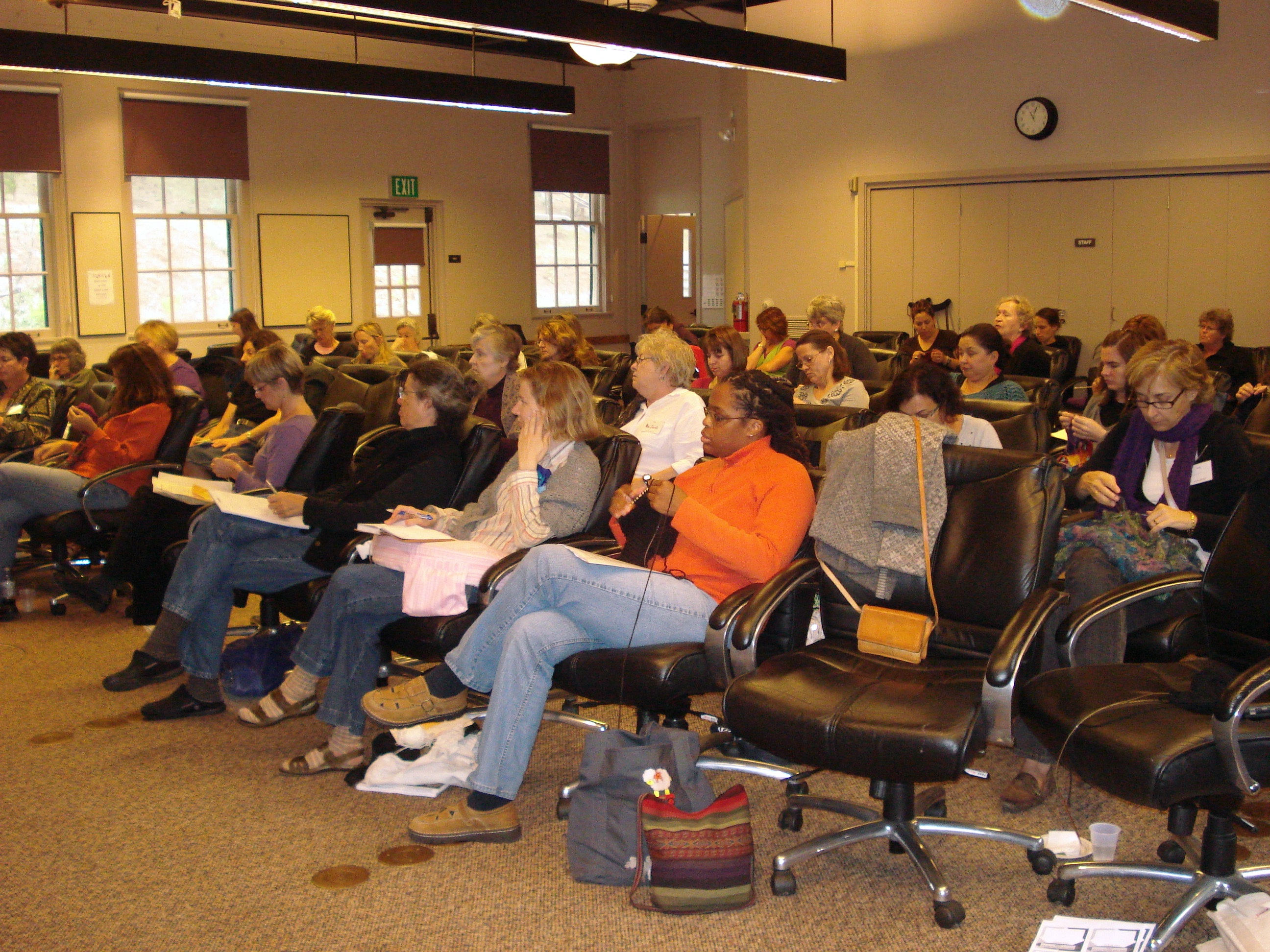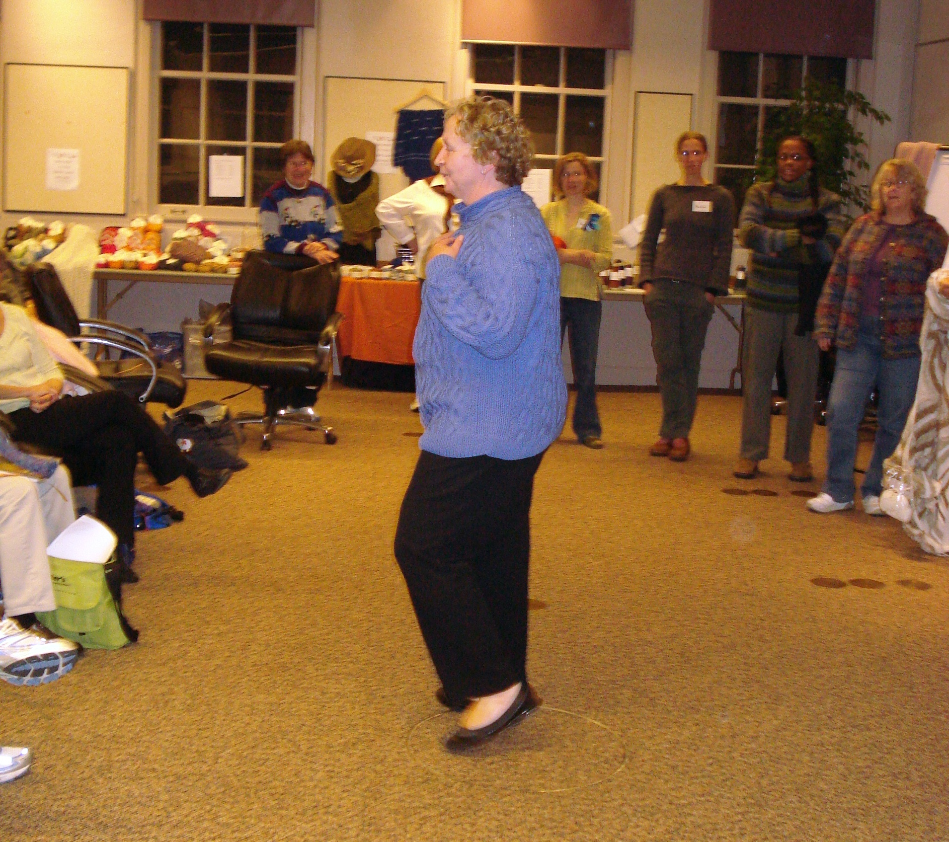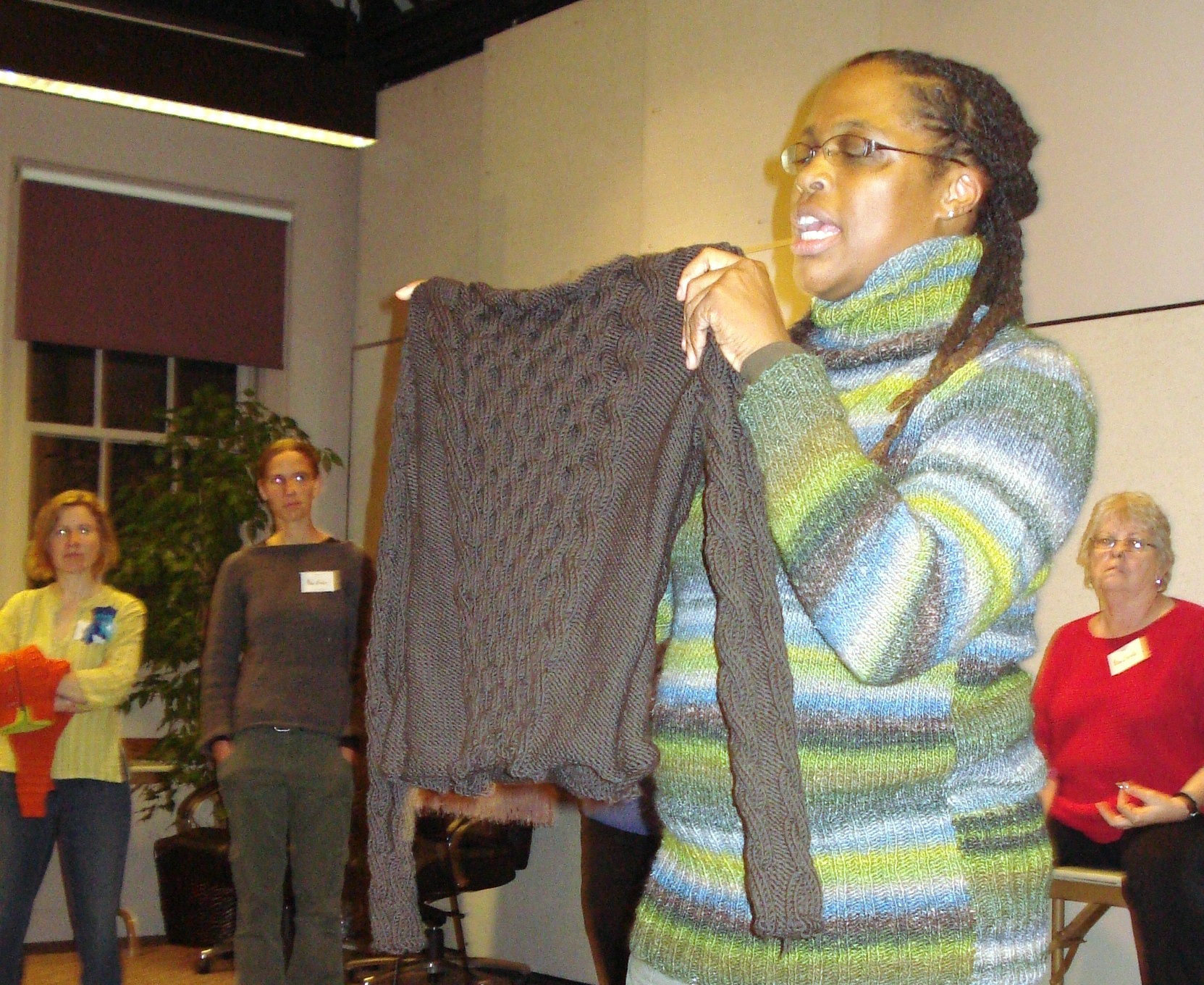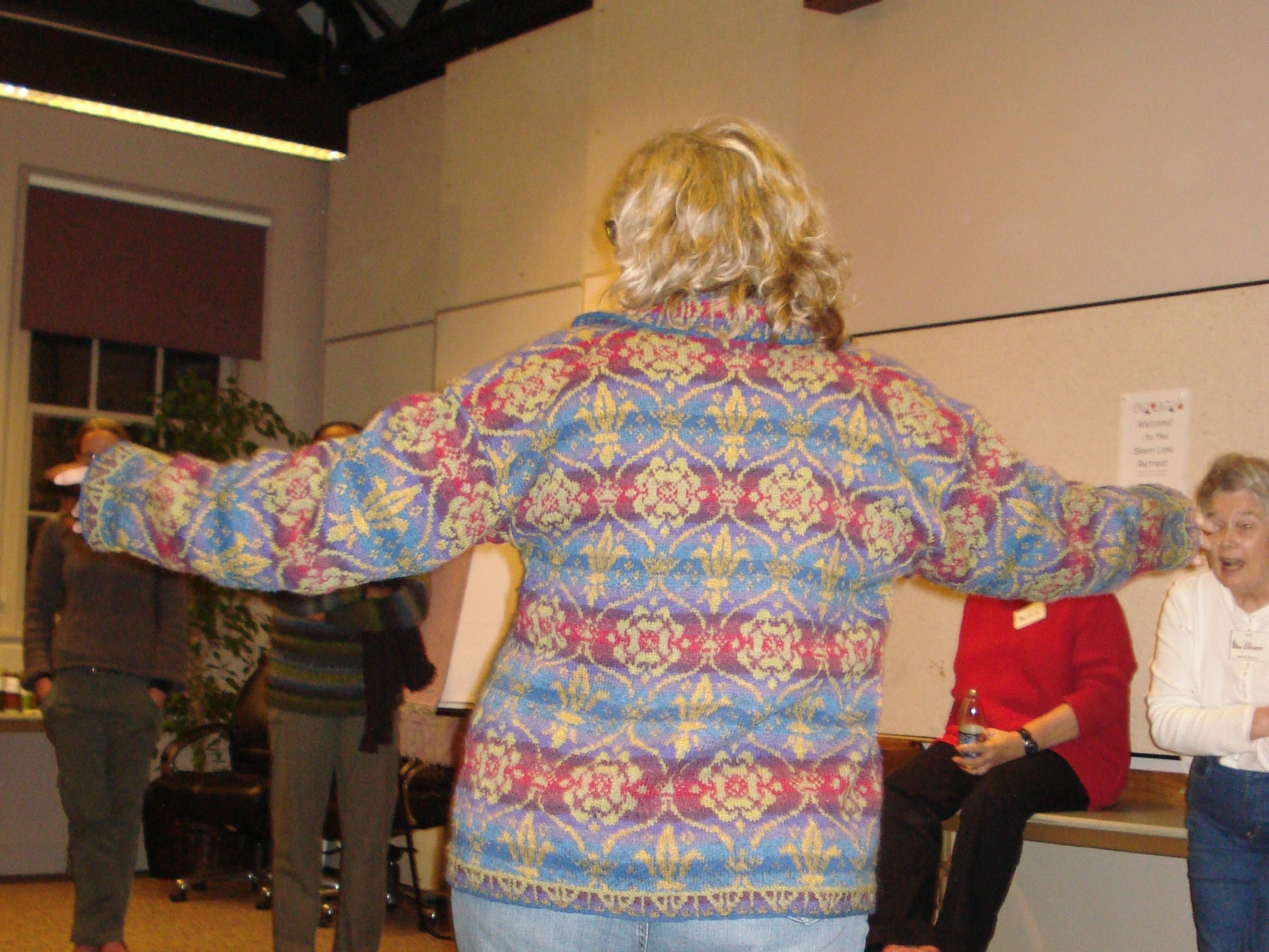 This year’s retreat fell on Eleanor’s husband’s birthday…and he joined for the weekend. He was such a good sport…he read while we were in workshops……he modeled not only a sweater for Eleanor…but one for Alice….and he also showed socks. Yeah Nick!