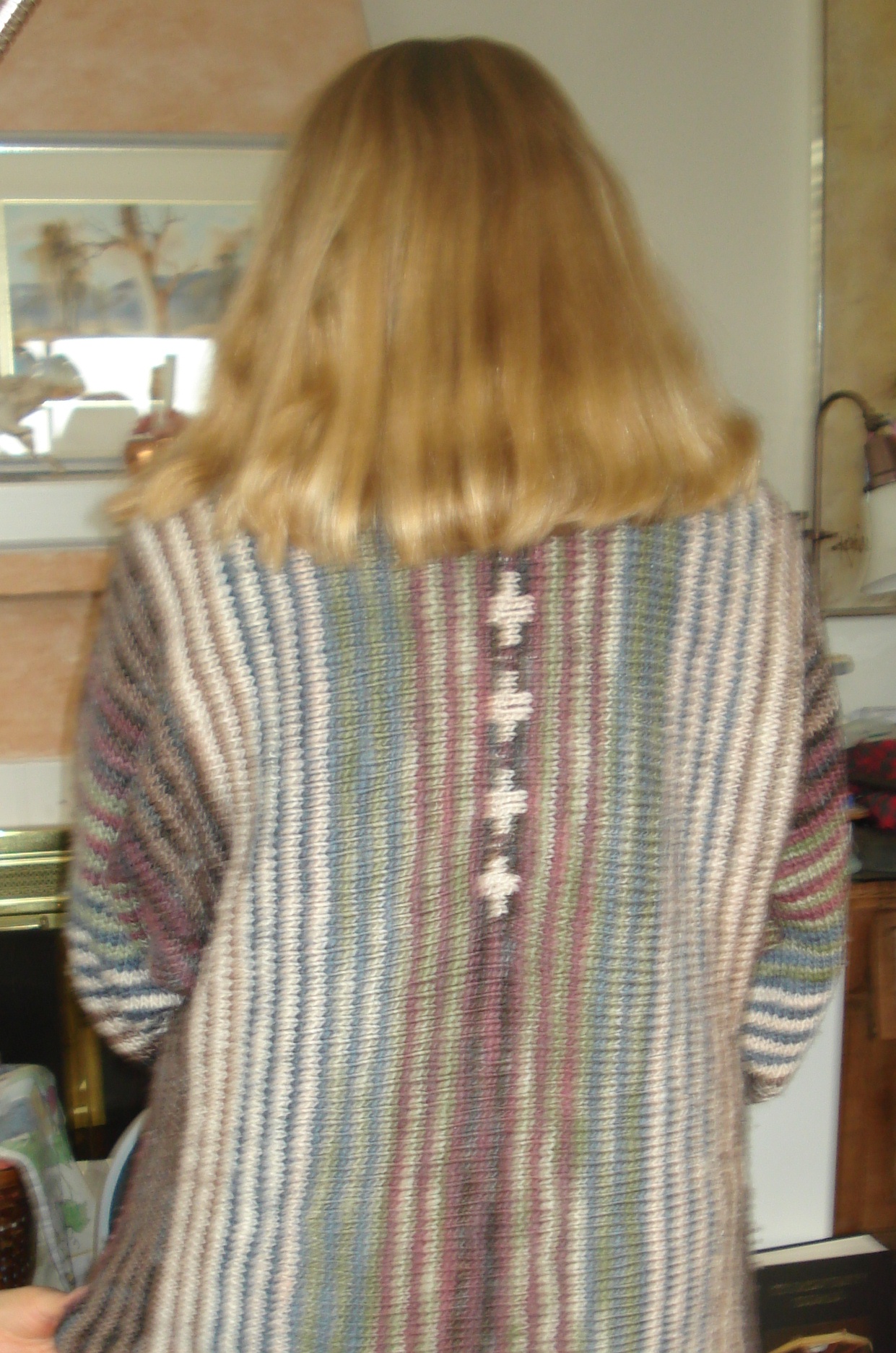 Sarah was wearing a sweater that she made some ago….and we were all enthralled. Sarah tells us, “The pattern is from a Manos del Uruguay booklet – the Design Source Collection # 1. This one is called The Pinstripe Jacket”. She looked lovely in this lovely (yes…I know it’s a play on words) design. Notice her face is not showing…she did say she doesn’t like to photo pose…but the design is so great that we must show. And here’s Sarah!