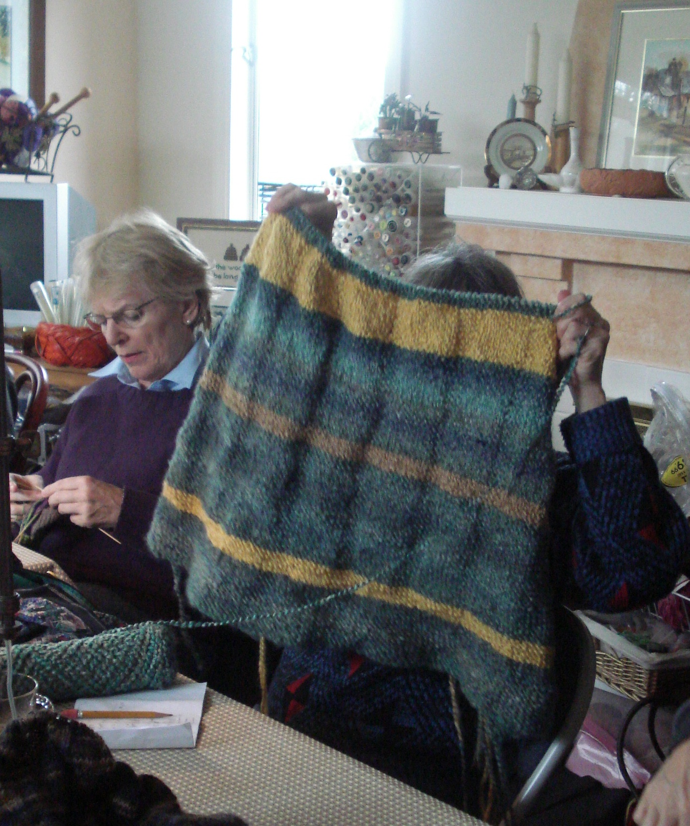 In addition to the above projects there were many process – Cathy is using her yarn remmants to knit the most beautiful socks; Eleanor is working on socks for her husband Nick; Carol is knitting a scarf; Maggie is reworking her sweater – gauge was off (I’ll talk more about this in a future post).