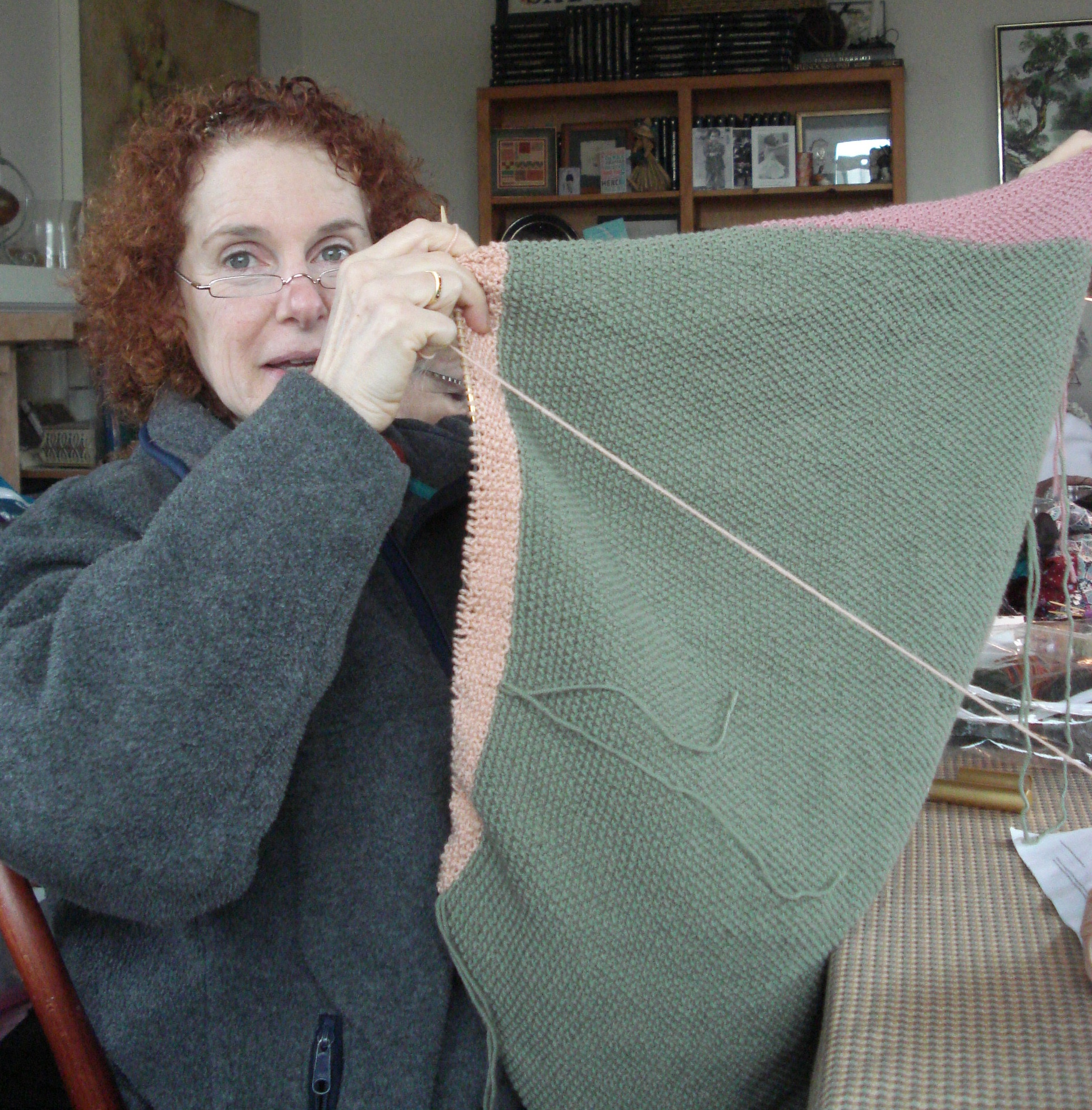 And we have another baby blanket. Shari is knitting with Debbie Bliss Baby Cashmerino. She loves the yarn…and is not excited about seed stitch. Now that she is nearing completion of this project, she thinks it’s wonderful…but a couple of weeks ago she described the project….”If I believed in heaven and hell, I would say that I am in knitting hell!” This brought rounds of laughter.