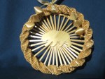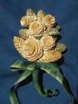 I donated the piece that they raffled last night back in December for the Christmas boutique but it didn’t sell. Judy asked me if it was OK if they raffled it last night. The problem is that I don’t remember exactly what the piece looked like. I do different things all the time, and sometimes I don’t repeat designs so they are one of a kind. So I am attaching a few of my other pieces (mostly given away as gifts so they never got on Etsy). The crucifix was a commission that I did a year ago, and the Mother & Child piece I made for the California State Fair a few years ago (I’ve only made one of those). So forgive me if I give you more than you wanted. You can probably tell the smaller ornament-sized weavings. The Celtic Knot is done on a 10″ brass ring. That and the Mariee de Moisson (Bride of the Harvest) are my favorite wedding pieces to do. I also love to do straw brooches, an example of which I’ve attached. Feel free to use these photos if you like. Thanks for your complimentary words today! Best, Nan”