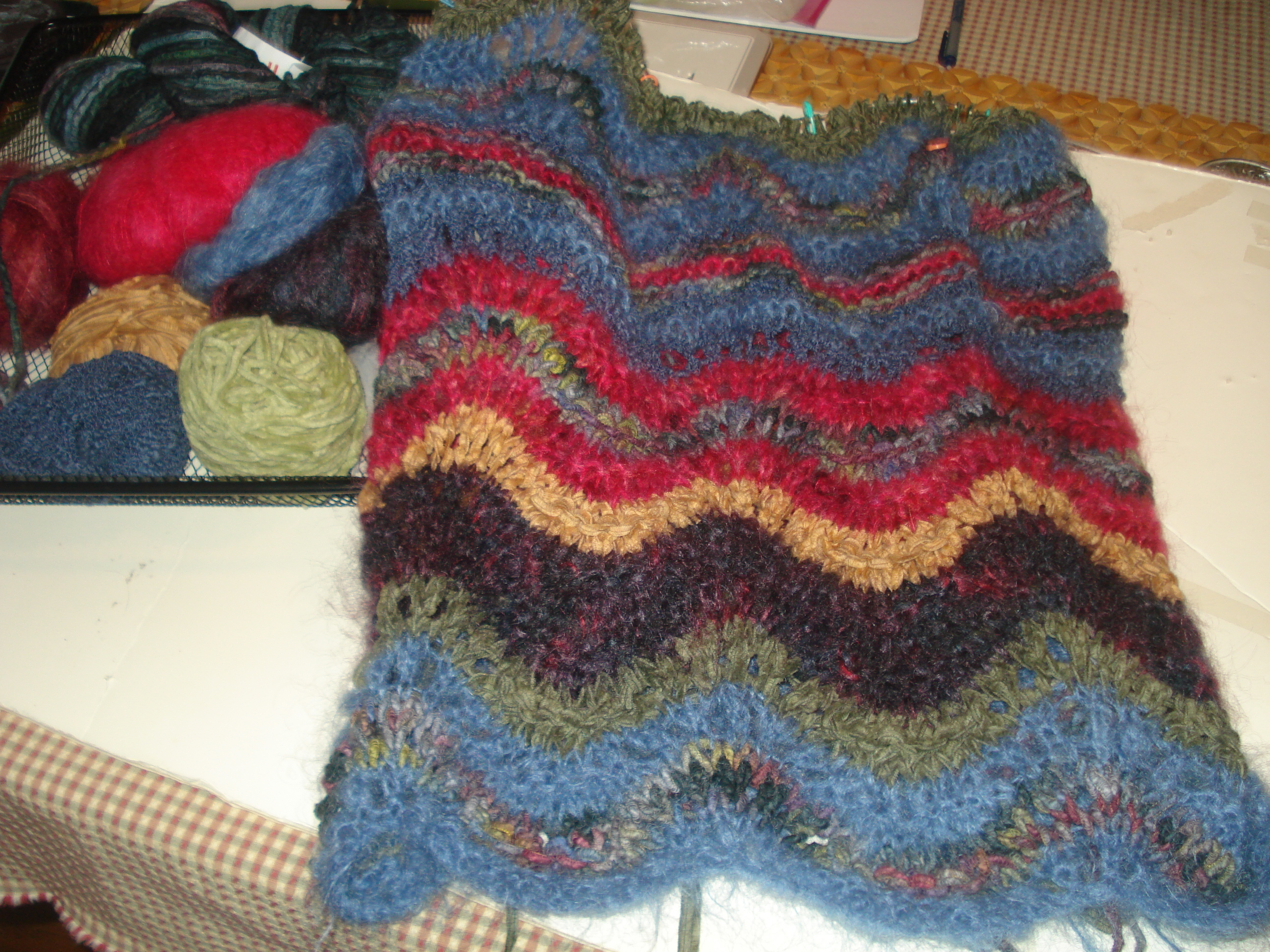 Some of you may recall that it’s been several years since my dad died…and thus several years since I gave Avril, my cousin’s wife, a gift of Collinette yarn for the help that she and Del gave me to during Dad’s illness. While I was flying to Denver recently, knitting the afghan for the recent wedding gift for Bill’s granddaughter, I thought about what I could do for Avril and Del this time. I was going to be their house guest for a week….and they are without a doubt the most generous hosts as well as such good friends. What I could do that would be thankful? I remembered the yarn and wondered whether Avril had knit the sweater that had been featured in Vogue magazine. When I arrived and we were waiting for my luggage, I brooched the topic…”Ive had an ephinany! If you haven’t knit that sweater yet I would like to knit it for you or knit an afghan. No need to answer me now…think about if for a couple days and let me know.” Well, a few days went by and it was the night before leaving Limon tor the Denver airport to head back to Oakland….so…”Avril have you thought about the yarn?” She had and decided that she would like to have an afghan.