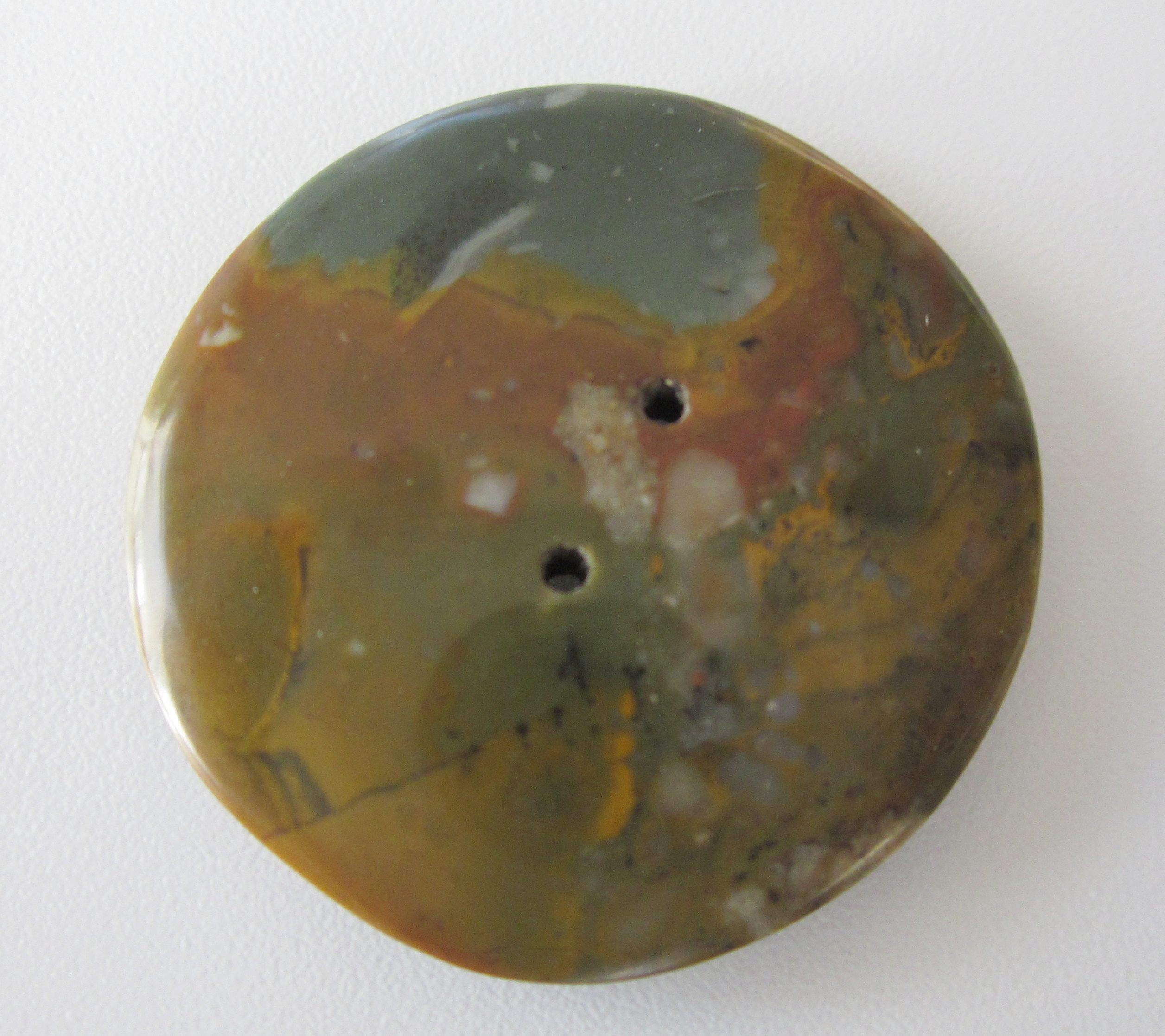 Just recently I learned that he crafted buttons for his sweater with the wonderful combination of the colors that he used in the knitted garment….. he just gifted me with one of those buttons….I was more than a little touched. The details on this button are that it is Bloodstone Jasper. He purchased a rough hunk of it from Ed’s Gems in Oregon. You can also find Ed’s Gems on Facebook.)He slabbed it, marked it, cut out a circle, drilled it and polished it. A button was born! Whoops…crafted!