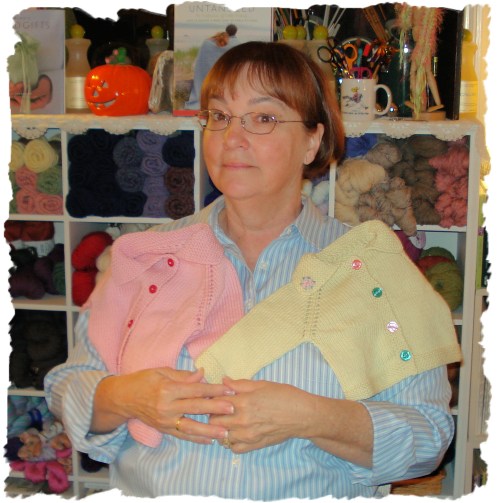 Helen with knitted gifts of love!