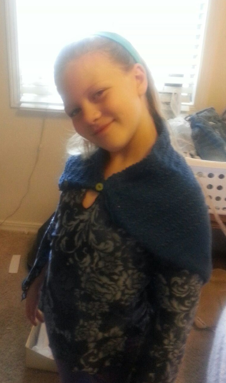 In early January I saw this great looking cowl from Annie’s Catalog posted on Facebook….I immediately sent a copy to my Idaho sister asking if she thought her daughter Jade would like it. The answer yes…..we chose the color blue. Jade’s birthday was in early February and her present (somewhat true to form) arrived at her doorstep late February. She had a “photo shoot” yesterday. Jade gave us a couple versions of how she would wear it.