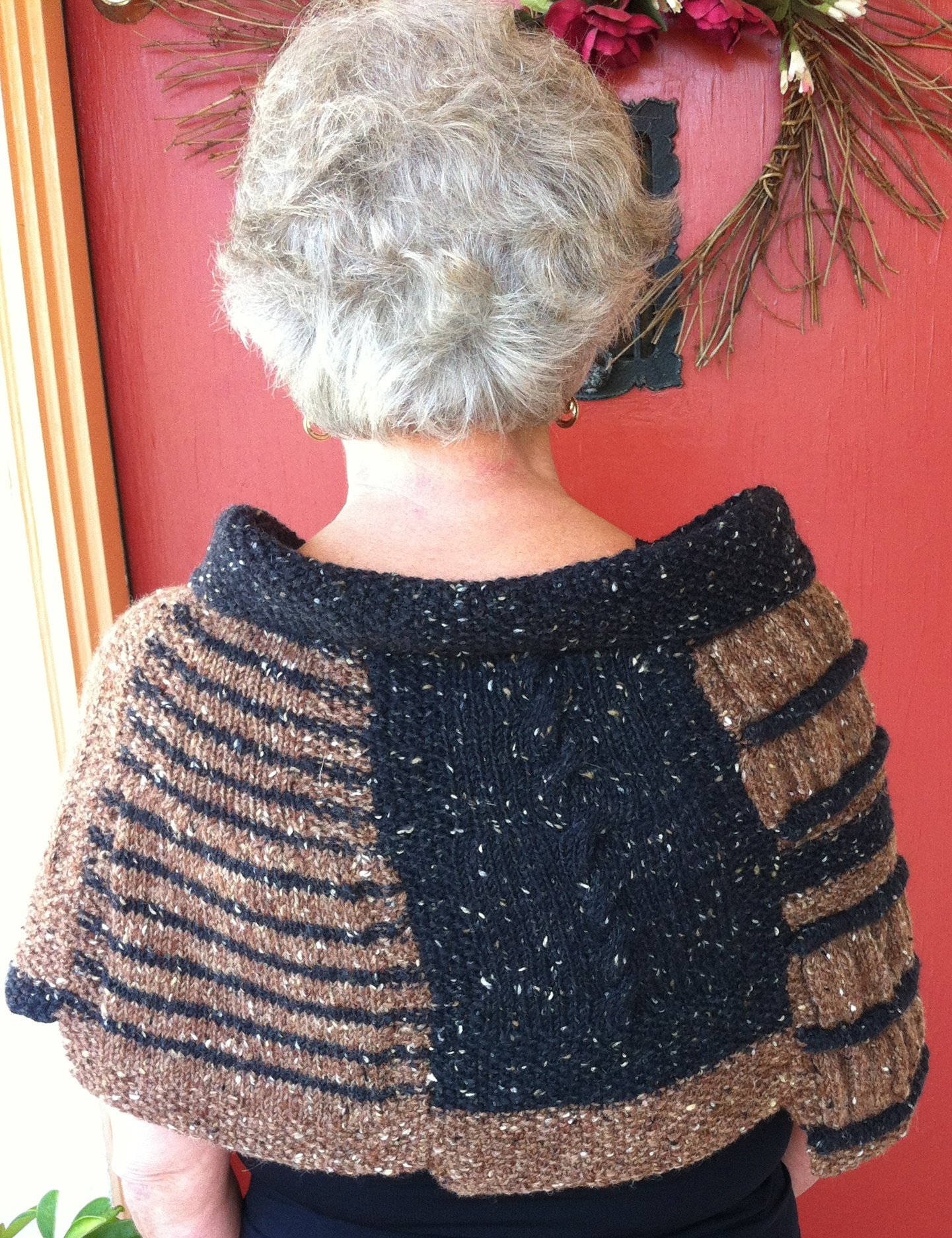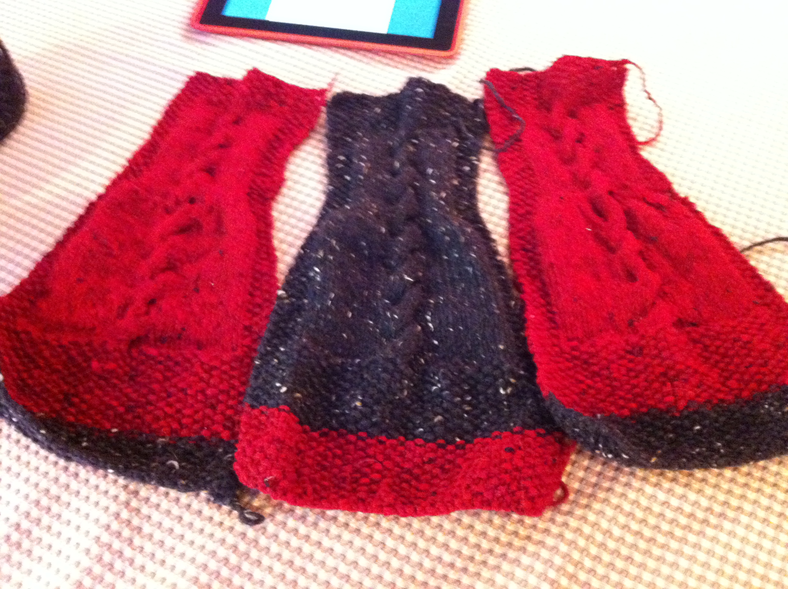 I have photos to share here about the progress points in this project as well as Debbie’s progress in her project. She is knitting the O’Dolan Wrap in the colorway of Red/Black and she is following the pattern design. She will look lovely in the original design.