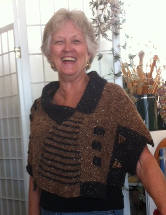 Note that I have knit this wonderful design with my own trademark stamp…I rarely knit a pattern exactly as presented. So…what did I do differently? The pattern calls for the striped area to be tartan design which means the knitted stripes would be intersected with embroidered stripes. I dress simply to say the least…and the tartan (while beautiful) was too much for me. I made yet one more change…the collar called for a loop knit stitch design…beautiful and yet another feature too much for me. I changed the collar to seed stitch that matches the bottom edges. I love my rendition of Maggi’s vision.