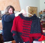 We had way too much fun at Thursday knitting…Debbie and I were over the top comparing our wraps…..the O’Doyle Wrap designed by Maggi Jackson of MaggiKnits. We each put our knitting “stamp” on our designs. Debbie added decorative pieces under her buttons….she inadvertently changed the line up of her pieces before seaming…it works! I changed the collar to seed stitch rather than the loops. Debbie and I have more in process to share re: MaggiKnits designs. The end result is so fun…along the knitting path we always make change….because we are knitters and that is what we do!
