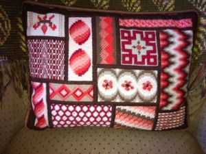 This needlepoint pattern was often seen in needlepoint classes – a great stitch sampler.