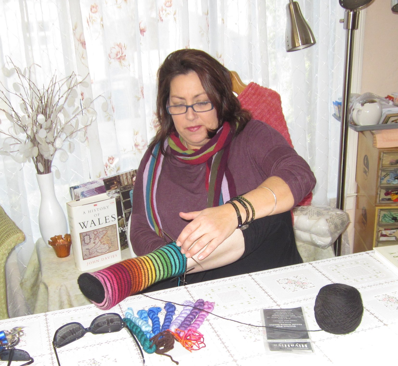 Bonnie recently purchased this lovely colorful packet of mini-skeins of yarn….I think it was at the Interweave Knit Lab last fall. She has designed her sock with her color line-up choices and she is custom-shaping. I love this sock and the custom fitting!