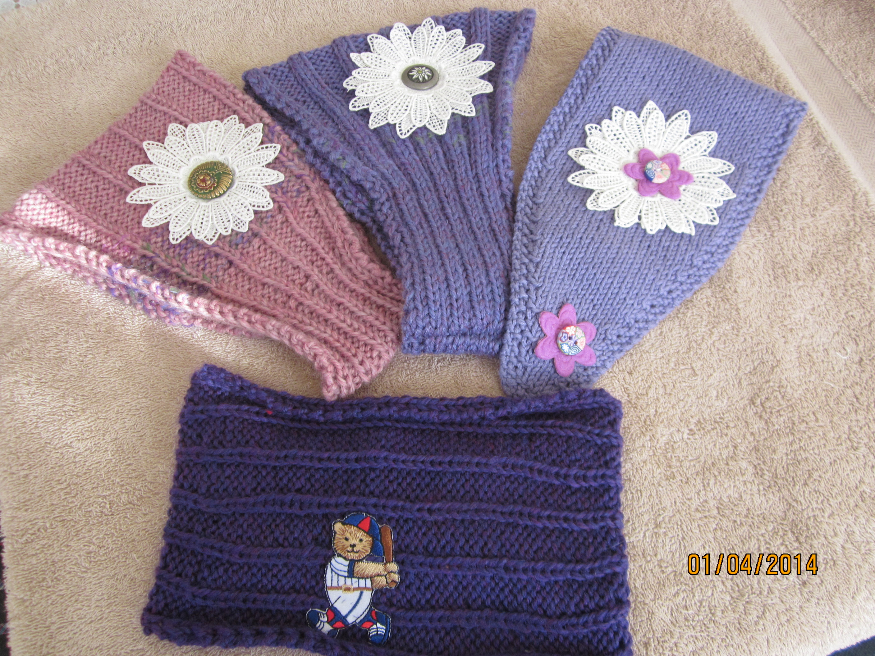 You might recall that I mentioned that I had four belated Christmas gifts (headband earmuffs) in the making for Idaho nieces and nephew. I cracked the whip one Saturday in early January and I was able to finish and send the gifts. Check out my nephew’s video thank you! I have a couple tips for you in making gifts for those who live long distance. For the two ear muff/headbands on the left I pinned the adornment on so that the girls could remove/change at a moment’s notice. For the one on the right I left a long thread so that my sister or her mother could crochet the correct length for the loop (so that it would fit around the head perfectly).
