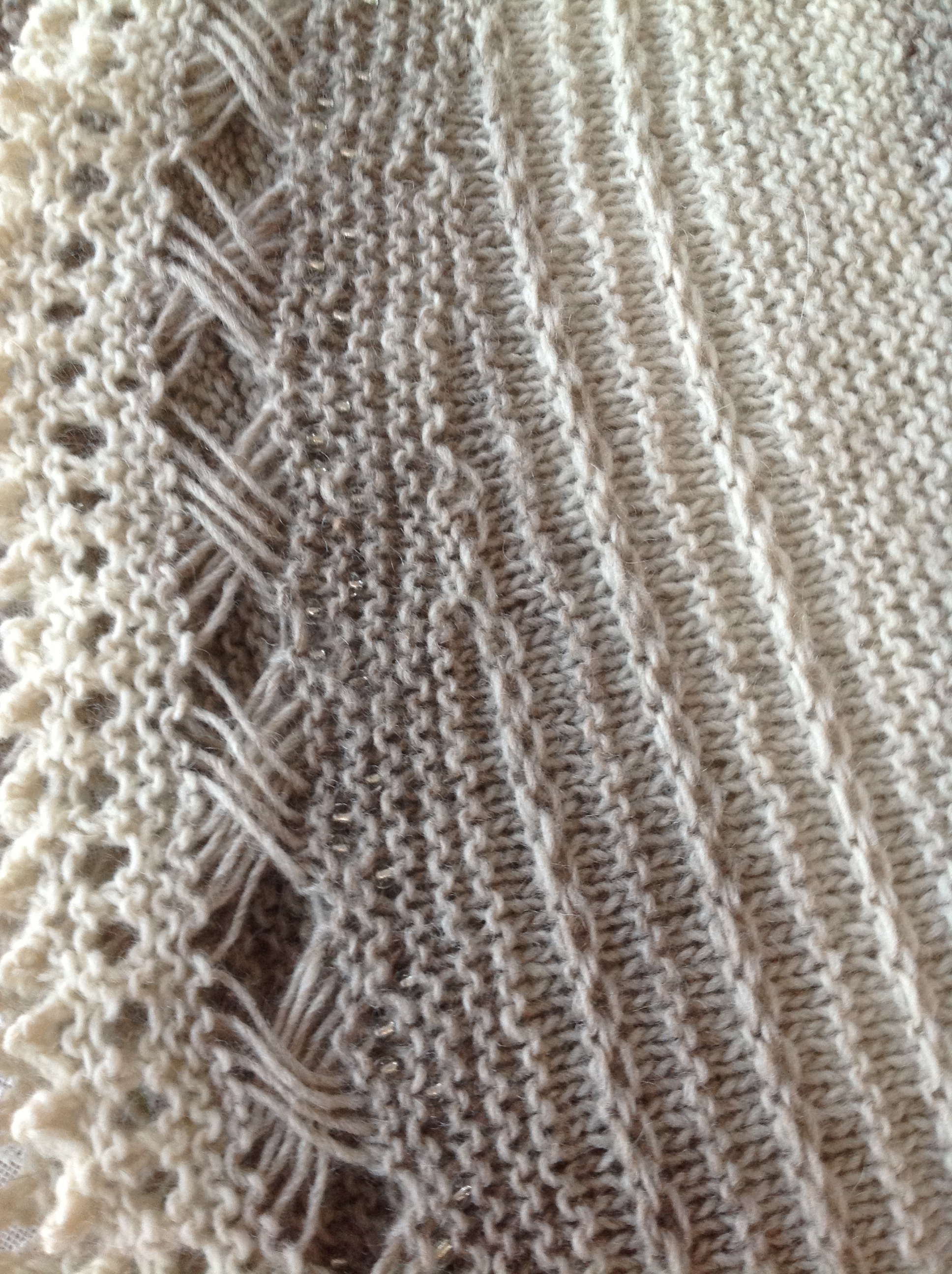 This wrap, knit in Simply Fine yarn from Green Mountain Spinnery, started out to be the Gillette Wrap. I saw the pattern and wrap at Stitches West 2013….loved the yarn and thought I liked the pattern. But……after casting on the needed 277 stitches and doing the short row shaping and starting the lace section, I realized this was not the design for me. First off, I read the short row W&T (wrap and turn) too literally…..I short rowed but didn’t wrap. I know better! I was past the garter design and into the lace pattern when I decided that I had to start again. Not only was I fussing about the W&T’s , I now thought the original lace section was too froo froo for me.