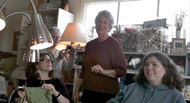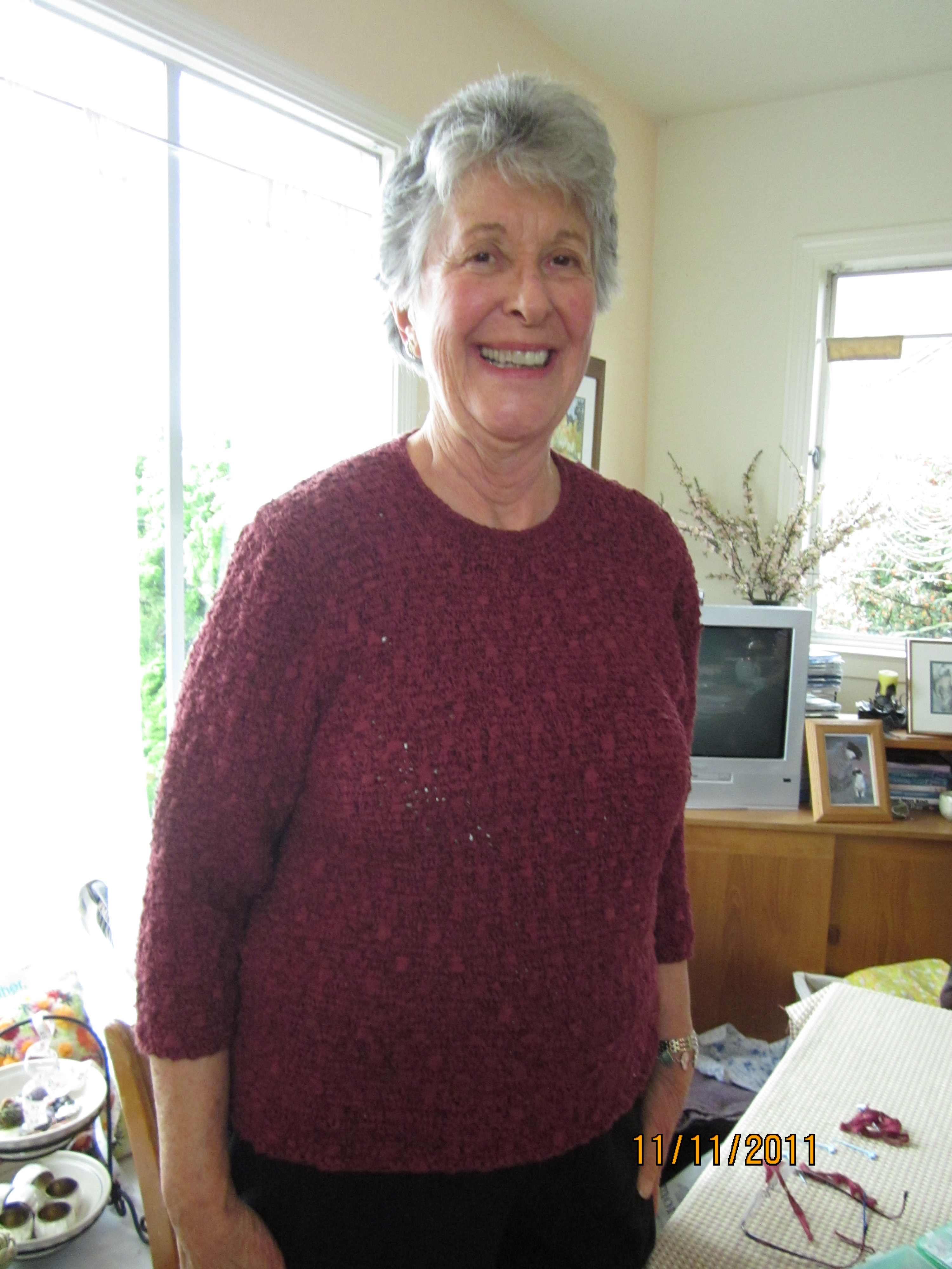 “It was a very touching service. Church had to bring in extra chairs for the overflow crowd. The minister, a woman knitter who had become a personal friend of Barbara’s, gave a lovely “sermon” entitled “A Stitch in Time” in which she referred to the strands that make up the fabric of our lives and spoke glowingly of Barbara’s love of knitting and teaching and sharing. There was a nice reception afterwards at the church and her family had changed clothes so that everyone (husband, son, daughter-in-law, two grandchildren) was wearing a sweater knit by Barbara. The walls were hung with her knit sweaters!